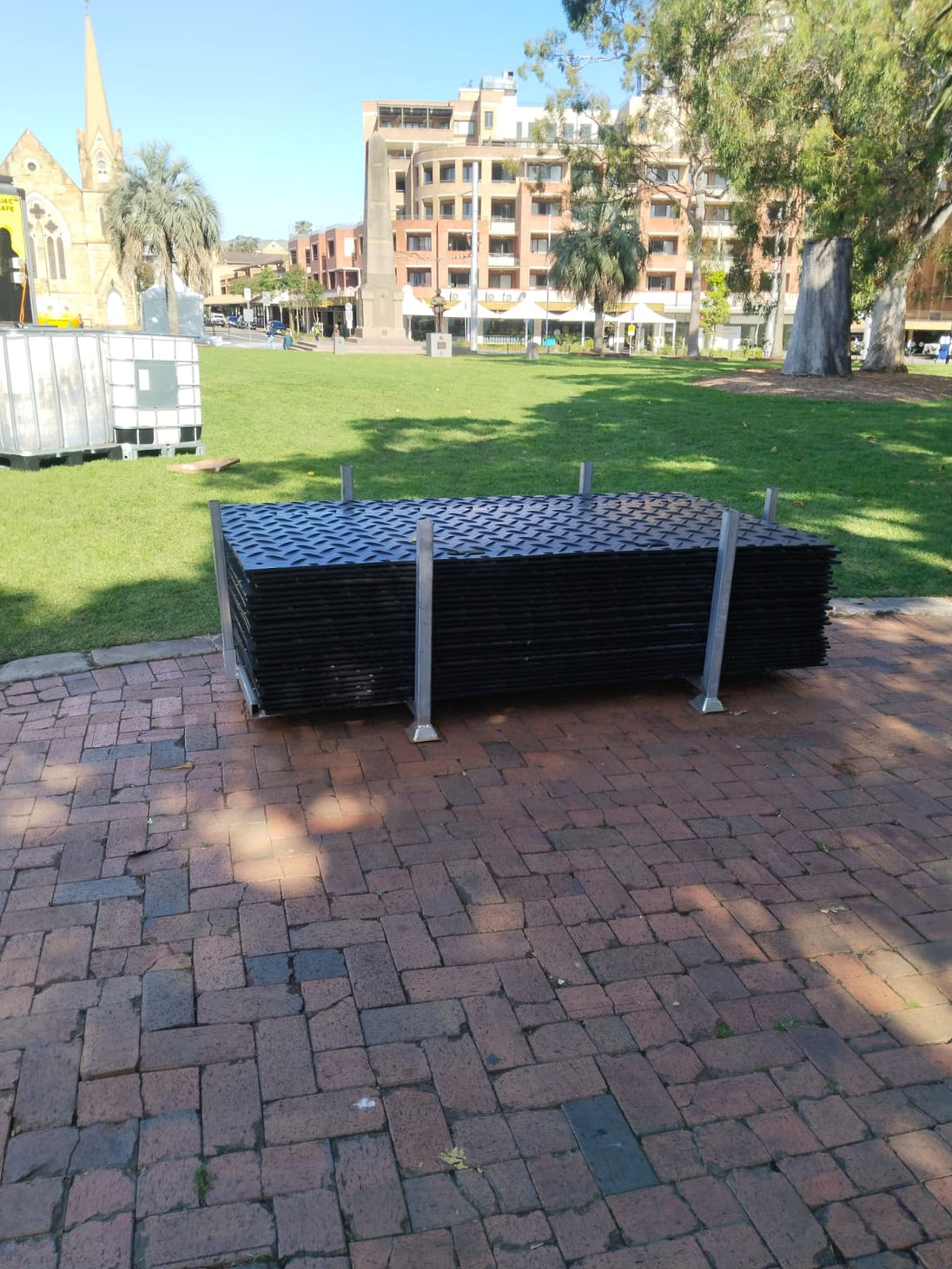 A pack of 25 x Ground Protection Mats with metal transport stilage